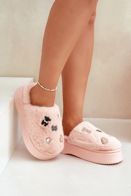 Futrzane Kapcie Damskie Na Grubej Podeszwie Z Przypinkami Różowe Zintoria