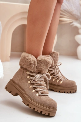 Sznurowane Trapery Damskie Z Futerkiem Ciemnobeżowe Vaminia