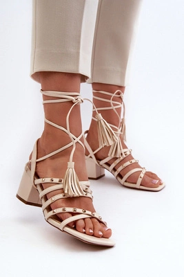 Wiązane Sandały Na Niskim Obcasie Ozdobione Ćwiekami Beżowe Chrisele