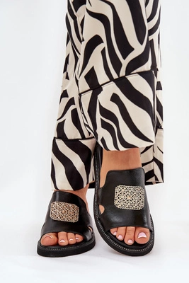 Klapki Damskie Na Koturnie Eko Skórzane Z Ozdobą Czarne Sarela