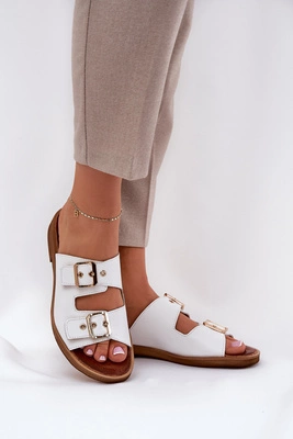 Skórzane Płaskie Klapki Z Klamrami Zazoo 3020 Białe