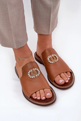 Eleganckie Skórzane Klapki Damskie Z Ozdobą Zazoo 3008 Camel