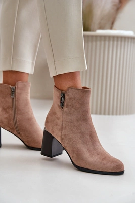 Ocieplane Eko Zamszowe Botki Damskie Na Słupku Zapinane Na Zamek Brązowe Erillia