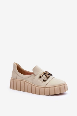 Skórzane Półbuty Damskie Na Platformie Z Ozdobą Beżowe Lewski 3398