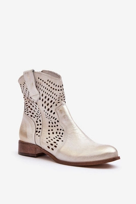 Zazoo 3305/2 Damskie Skórzane Ażurowe Botki Kowbojki Złote