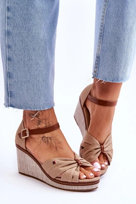 Sandały Damskie Na Plecionym Koturnie Ciemnobeżowe Judith