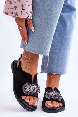 Zamszowe Sandały Japonki Z Kamieniami Czarne Frency