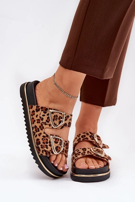 Klapki Damskie w Panterkę Na Platformie Ze Złotymi Klamrami Brązowe Tersele