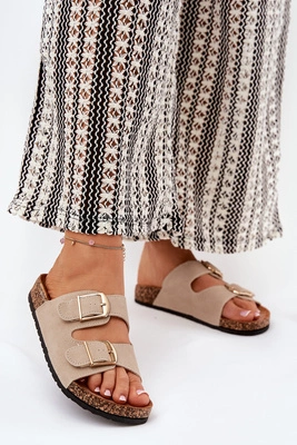 Klapki Damskie Na Korkowej Platformie Ze Złotymi Klamrami Beżowe Lisavionea