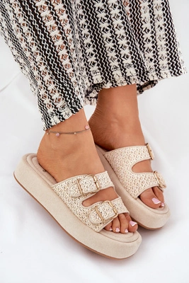 Klapki Damskie Na Platformie Z Klamrami I Plecionką Beżowe Limme