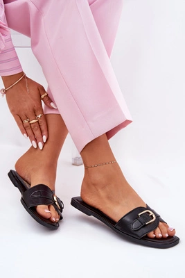 Płaskie Klapki Damskie Ze Złotą Klamrą Czarne Esiobb