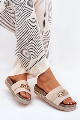 Klapki Damskie Ze Złotym Detalem Na Platformie Z Brokatem Beżowe Eanes