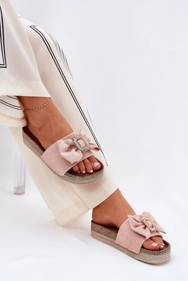 Klapki Damskie Na Platformie Z Kokardką I Ozdobną Broszką Różowe Lenela