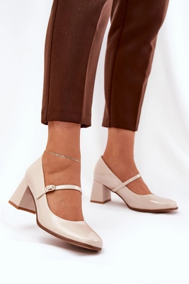 Lakierowane Czółenka Na Słupku Z Paskiem I Sprzączką Beżowe Tammirea