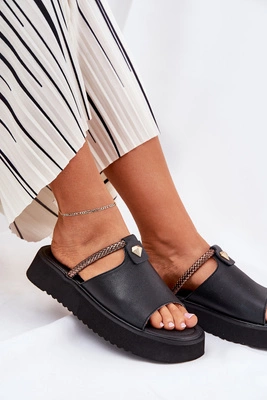 Skórzane Klapki Damskie Na Platformie Z Ozdobnym Paskiem D&A MK51-475 Czarne