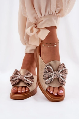 Klapki Damskie Na Koturnie Z Kokardą Złote Moonzella