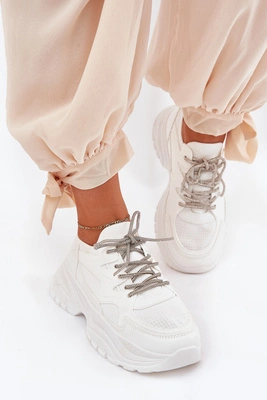 Sneakersy Damskie Na Platformie Ozdobnym Sznurowaniem Białe Evalianne