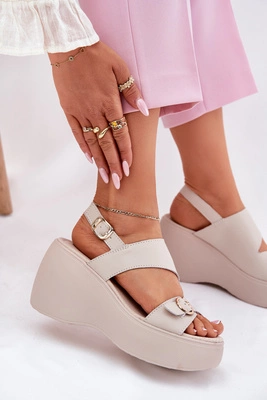 Skórzane Sandały Damskie Na Koturnie I Platformie S.Barski LR51-540 Beżowe