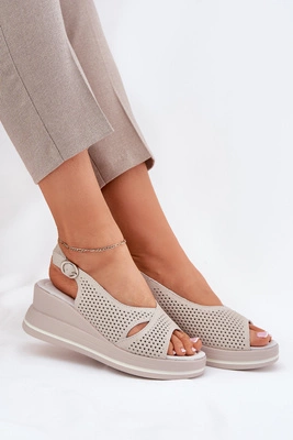 Skórzane Sandały Damskie Na Koturnie S.Barski LR51-660 Beżowe