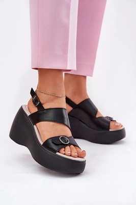 Skórzane Sandały Damskie Na Koturnie I Platformie S.Barski LR51-540 Czarne
