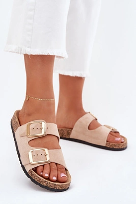 Klapki Damskie Z Eko Zamszu Złote Klamry Beżowe Vorella
