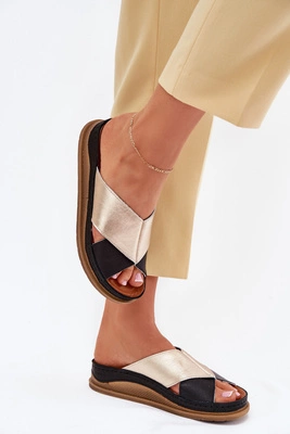 Skórzane Klapki Damskie Na Platformie Maciejka L4986-25 Złoto-Czarne