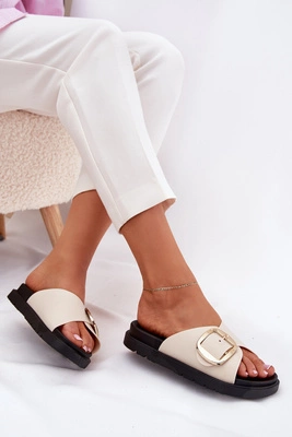 Klapki Damskie Na Platformie Ze Złotą Klamrą Beżowe Jovira
