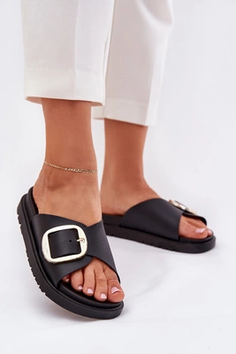 Klapki Damskie Na Platformie Ze Złotą Klamrą Czarne Jovira