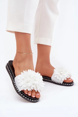 Klapki Damskie Ozdobione Kwiatami Białe Cellanen