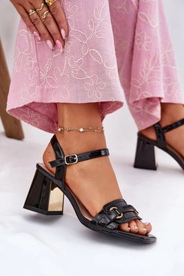 Skórzane Lakierowane Sandały Damskie Na Słupku Czarne Mevonelle