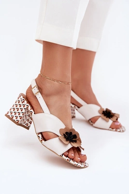 Skórzane Sandały Damskie Na Słupku Z Kwiatami Laura Messi 2950 Białe