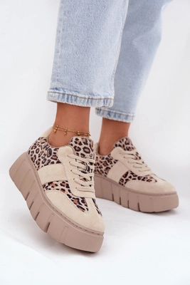 Zamszowe Ocieplane Sneakersy Damskie Na Masywnej Platformie Vinceza 66841 Panterka Beżowe