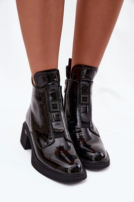 Lakierowane Skórzane Botki Damskie Z Tłoczeniem Na Klocku Czarne Lorenza