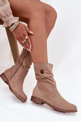 Ocieplane Botki Damskie Z Marszczoną Cholewką Na Płaskim Obcasie Beżowe Krisia