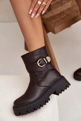 Ocieplane Botki Damskie Ze Złotą Klamrą Czekoladowe Elanore