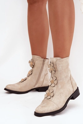 Ocieplane Botki Damskie Na Płaskim Obcasie Z Ozdobnymi Kwiatkami Złote Pravienne