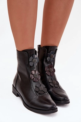 Ocieplane Botki Damskie Na Płaskim Obcasie Z Ozdobnymi Kwiatkami Czarne Pravienne
