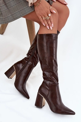 Kozaki Damskie Na Słupku Ze Złotym Elementem Czekoladowe Alessine