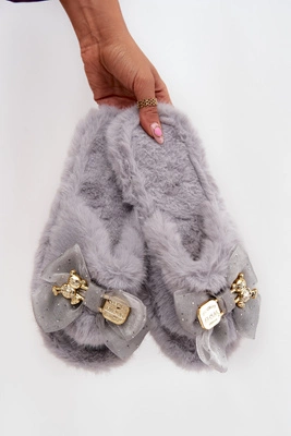Futrzane Kapcie Damskie Z Kokardą I Złotą Ozdobą Szare Nolara