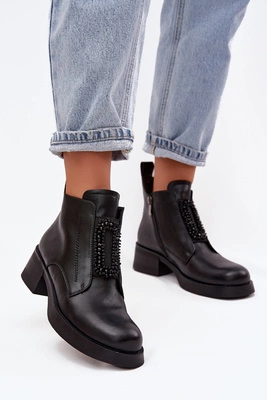 Skórzane Botki Damskie Na Klocku Z Ozdobą D&A JC52-869 Czarne
