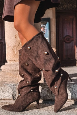 Wsuwane Kozaki Damskie Na Szpilce Ze Złotymi Ozdobami Czekoladowe Thaliane