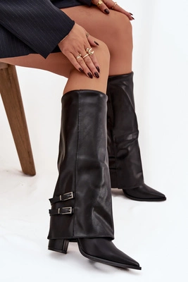 Kozaki Damskie Na Słupku Z Wywiniętą Cholewką I Klamrami Jessae Czarne