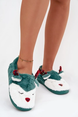 Kapcie Świąteczne Damskie Z Motywem Renifera Futrzane Zielone Orsella