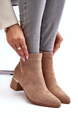 Zamszowe Damskie Botki Na Słupku Z Ozdobą Beżowe Menoria