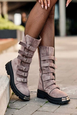 Zamszowe Wysokie Botki Workery Z Paskami Ciemnobeżowe Elnatea
