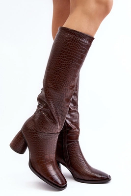 Damskie Kozaki Do Kolana Na Słupku Wężowy Wzór Brązowe Ceriona