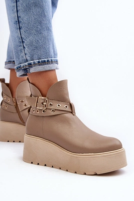Skórzane Botki Damskie Na Koturnie Platformie Z Paskami Zazoo 1752 Beżowe