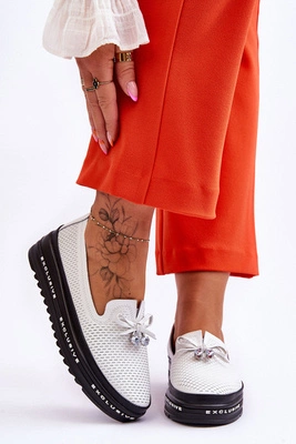 Damskie Ażurowe Skórzane Tenisówki Slip-On Białe Sorito