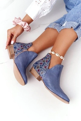 +14Skórzane Botki Maciejka Granatowe Z Kwiatami 04091-64