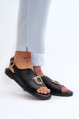 Skórzane Sandały Damskie Ze Złotą Ozdobą Czarne Vinceza 7910